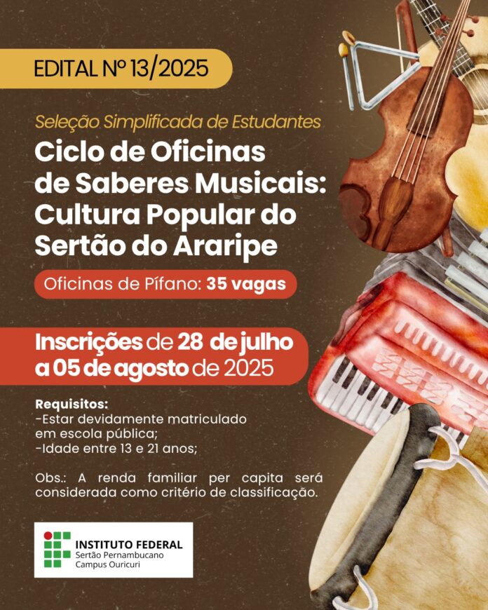 O Campus Ouricuri do Instituto Federal do Sertão Pernambucano (IFSertãoPE) está com inscrições abertas para o projeto “Ciclo de Oficinas de Saberes Musicais: Cultura Popular do Sertão do Araripe”. A proposta oferecerá aulas gratuitas de pífano e oficinas de construção do instrumento, com o objetivo de valorizar a cultura local e promover o ensino da música tradicional da região.