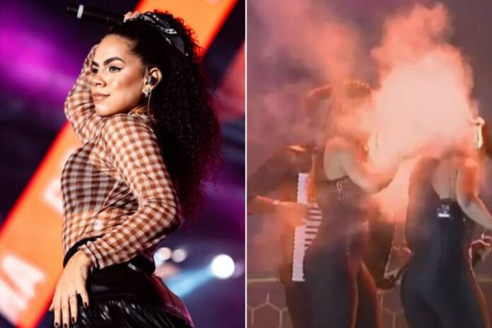Nas imagens divulgadas nas redes sociais é possível ver o momento em que as chamas queimam o cabelo da cantora. Em seguida, os integrantes da banda tentam prestar socorro e a retiram do palco.